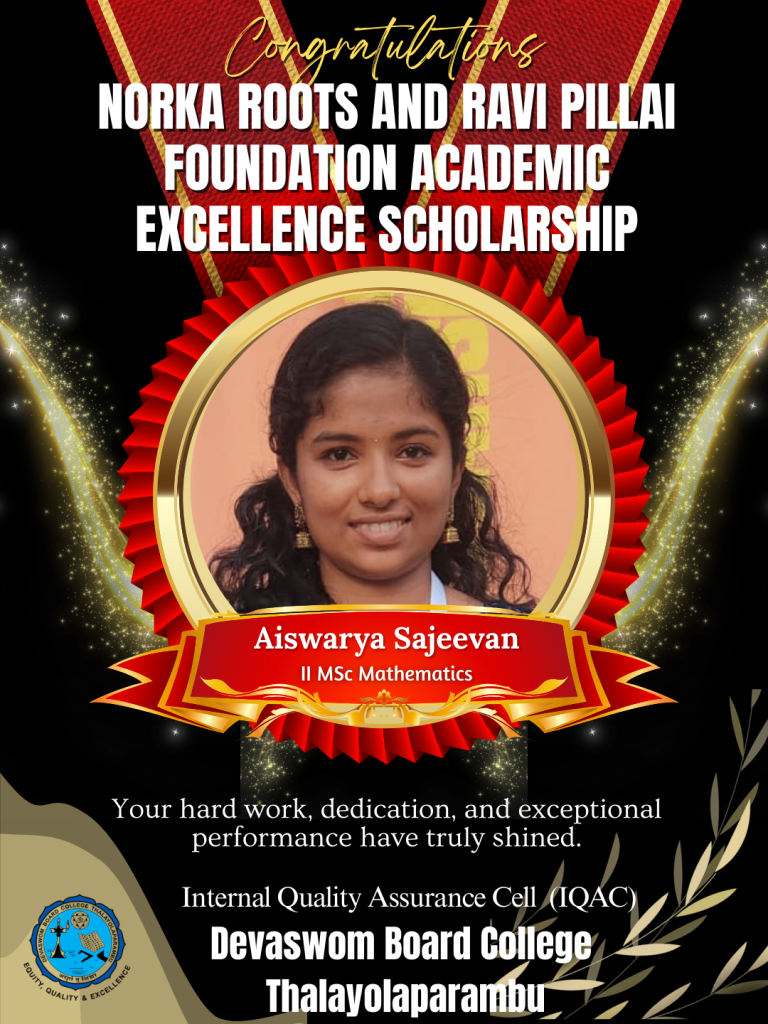 Aiswarya Sajeevan, II MSc Mathematics received the memento and cheque of ₹1.25 lakhs from the Norka Roots and Ravi Pillai Foundation Academic Excellence Scholarship at Nishagandhi Auditorium, Thiruvananthapuram ON 11.02.26, Wednesday.